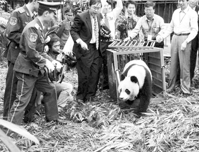 荊楚網(wǎng)消息(楚天都市報)一只野生大熊貓日前闖入四川省都江堰鬧市(本報曾予報道),被當?shù)亓謽I(yè)部門營救,并被送往臥龍自然保護區(qū)療養(yǎng)。8月8日,戴有GPS衛(wèi)星定位儀器的大熊貓被放歸都江堰龍溪虹口國家自然保護區(qū)。當天,它沒說拜拜就踏出鐵籠走入密林,前后不到10秒鐘。科研人員在今后一年多的時間內,將對它進行定位跟蹤,這有助于科學家進一步了解和掌握大熊貓野外生活習性和活動規(guī)律。(新華社發(fā))