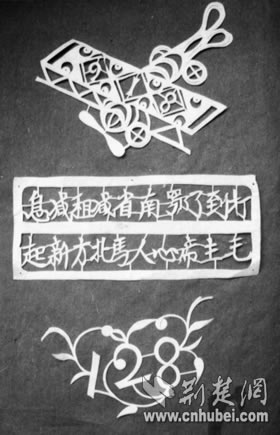 中國(guó)剪紙起源于裝飾藝術(shù)。樣式有窗花、燈花、喜花以及鞋墊花等。其中用來制作繡花底樣的雕花剪紙又名“花樣”,主要是供婦女刺繡使用的圖案底稿,大多是與民眾日常生活關(guān)系密切的傳統(tǒng)圖案。此次發(fā)現(xiàn)反映抗戰(zhàn)主題的50多張花樣剪紙,從構(gòu)圖、技法上看,比較稚嫩、粗糙,但充分體現(xiàn)了藝人們的創(chuàng)新精神。其中最顯眼的是一張邊緣殘缺、破舊的黃裱紙,上面依稀可見“兒童團(tuán)”三個(gè)字,是唯一的一張剪紙?jiān)。葉家慶介紹,寫著“打到了鄂南省減租減息,毛主席心(新)人馬北方新起”(如左圖)的花樣,從內(nèi)容分析,反映了1944年新四軍各軍區(qū)對(duì)日偽軍發(fā)動(dòng)春夏秋季攻勢(shì),并粉碎日偽軍反撲,解放國(guó)土、人口,改善華中各抗日根據(jù)地的斗爭(zhēng)形勢(shì)。