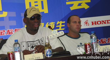 在記者會上,曾和喬丹、皮蓬一起被稱為“公牛鐵三角”、七屆NBA籃板的丹尼斯.羅德曼格外引人注目,記者圍繞著一些球迷感興趣的話題對他進行了采訪。當有人問起他為什么在見面會上會這么平靜時,他的回答幽默又讓人充滿期待:這里有這么多的攝影機、照相機和記者朋友,施展不開,當然要平靜。賽場上的我和此時的我完全不同,想看一個真正的羅德曼,明天去賽場吧。