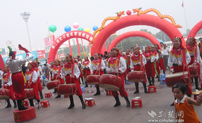 武漢市首屆時(shí)尚體育博覽會(huì)開幕式現(xiàn)場(chǎng)來自硚口區(qū)漢水橋街威風(fēng)鑼鼓隊(duì)在開幕式上進(jìn)行精彩的表演賽車俱樂部的車手和車模亮相東方神馬騎士俱樂部漂亮神氣的女騎士健身教練在進(jìn)行健身表演極限單車高手有驚無險(xiǎn)的表演