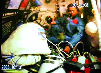 聶海勝正在進(jìn)行“穿艙”———從返回艙進(jìn)入軌道艙。
