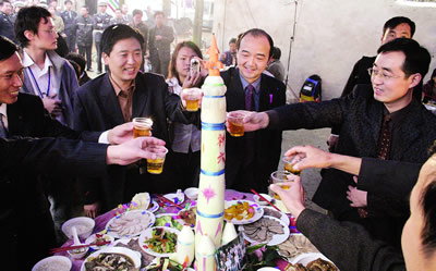 襄樊市委領(lǐng)導(dǎo)靳永龍、馬黎,棗陽市委書記常全華和聶新勝等人,來到精心制作的生日蛋糕前,切生日蛋糕。頓時(shí),歡樂的禮花四處綻放,鞭炮齊鳴。來自全國各地的百余名記者紛紛舉起手中的相機(jī),閃光燈閃個不停,爭相記錄下這難忘的一刻。