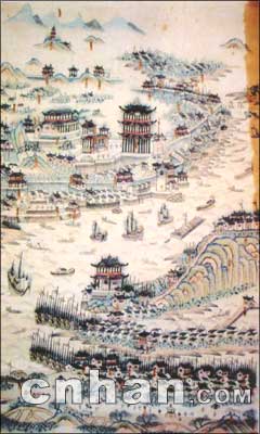 此圖藏于大連市圖書館,手繪彩圖。未標明作者姓名和成圖時間,圖中標注了武昌、漢口“龍王廟”等。筆者鑒定此圖為清代中期作品,根據(jù)是圖中有“龍王廟”,而龍王齋建于乾隆四年(1739年),故此圖當于1739年以后所繪。但圖中沒有出現(xiàn)漢口城堡,而漢口城堡建于1864年,同時圖中只繪有木帆船,而未出現(xiàn)現(xiàn)近代輪船。武漢江面出現(xiàn)航運和輪船是1862年以后。可知,此圖當成于1862年前?纱篌w界定此圖繪于1739年至1862年之間。