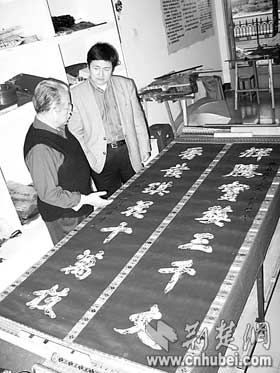 荊楚網(wǎng)消息(楚天都市報)(記者何君輝)昨日,收藏者王先生在漢繡傳人任本榮家中,展示了自己珍藏的一幅刺繡對聯(lián)。對聯(lián)長2.4米,以花朵圖案拼接出“輝騰寶婺三千丈香發(fā)琪花十萬枝”字樣。王先生說,自己十多年前在地攤上花400元購得這件繡品,一直沒有機會為它“驗明正身”