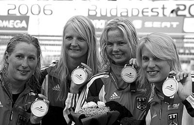 7月31日,在歐洲游泳錦標(biāo)賽女子4×100米自由泳接力決賽中,德國隊(duì)以3分35秒22的成績奪得冠軍,并打破了澳大利亞隊(duì)2004年創(chuàng)造的3分35秒94的世界紀(jì)錄。圖為德國選手達(dá)爾曼(左二)、格茲(右)、斯特芬(右二)和利普在頒獎(jiǎng)儀式上。