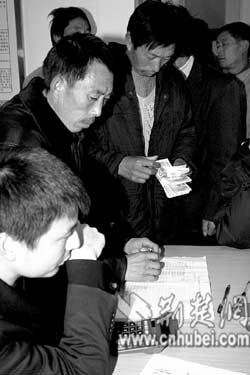 荊門(mén)麻城鎮(zhèn)譚珍國(guó)等農(nóng)民工,在天門(mén)市勞動(dòng)保障監(jiān)察大隊(duì)領(lǐng)取用人單位所欠的工資款(上圖)。去年12月以來(lái),天門(mén)市組織有關(guān)職能部門(mén)對(duì)全市37家用人單位支付農(nóng)民工工資情況進(jìn)行專項(xiàng)檢查,共查出6家用人單位拖欠農(nóng)民工工資,他們及時(shí)為2056名農(nóng)民工追回工資180余萬(wàn)元(下圖)。(特約記者肖金舫通訊員劉銀斌攝)