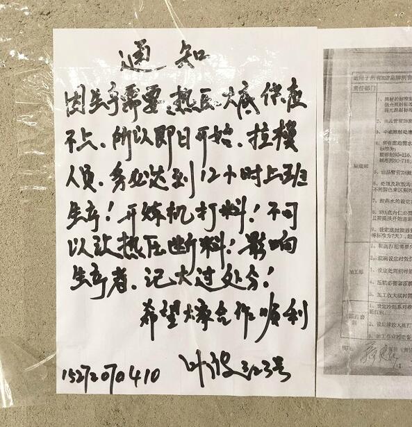 執(zhí)法人員查處時(shí),工人們并不驚慌,部分工人甚至繼續(xù)趕工。墻上張貼的通知寫(xiě)著:“因生產(chǎn)需要……拉模人員務(wù)必達(dá)到12小時(shí)上班生產(chǎn)。”廠方一負(fù)責(zé)人辯稱:這里不是在造假,而是讓工人練手藝。
