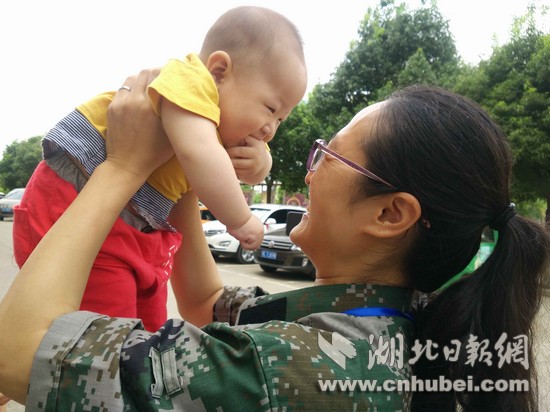 湖北日報網(wǎng)訊(全媒體記者 張愛虎 通訊員 江開群 秦修)6日上午8時30分,嘉魚縣陸溪鎮(zhèn)鎮(zhèn)長路紅云,到縣防指辦理防汛物資報領手續(xù),忙完后下樓,正是9時10分,見到婆婆抱著5個多月的兒子蕗熙趕來。乘著采訪的間隙,一身戎裝、皮膚黧黑的路紅云抱著兒子逗玩。