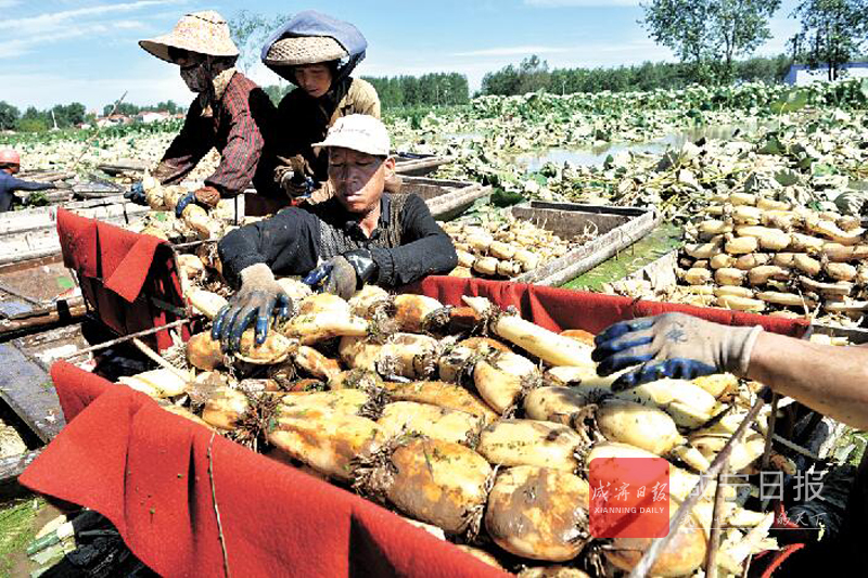7月28日,嘉魚(yú)縣陸溪鎮(zhèn)藕塘村鴻福農(nóng)產(chǎn)品加工有限公司蓮藕基地,數(shù)10位工人正在采收今夏第一批鮮藕。