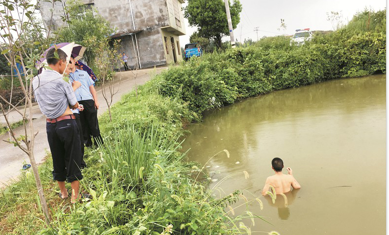 楚天都市報訊 圖為:萬某在水塘里游來游去不肯上岸