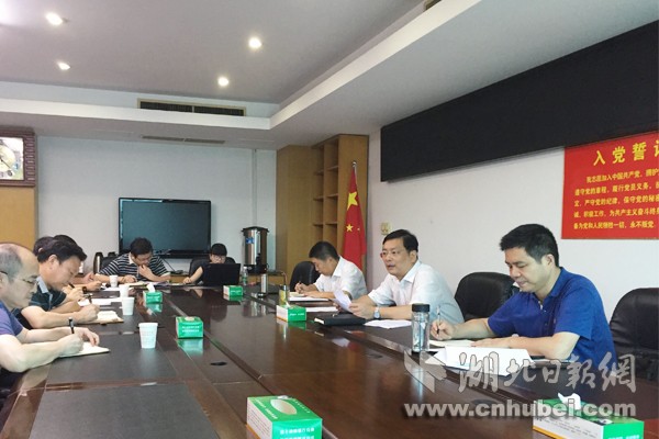 咸寧市委書記丁小強(qiáng)(右二)、咸寧市紀(jì)委書記程良勝(右一)、咸寧市委秘書長、市主體辦主任張方勝(右三)集體約談該市3家2016年黨風(fēng)廉政建設(shè)不合格單位黨委書記。記者 江萌 攝