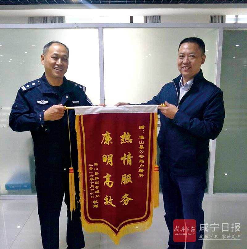 同日,通山縣城市福利院制作了一面錦旗送到戶籍民警手上,感謝公安戶籍民警熱情高效的為民、利民服務。