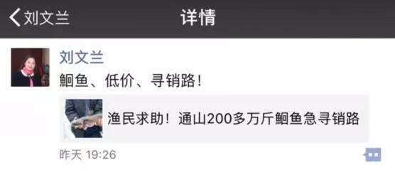 和丁小強(qiáng)一樣,中百超市副總經(jīng)理劉文蘭,也在朋友圈轉(zhuǎn)發(fā)了湖北日報(bào)的微信稿件,并配文:“鮰魚、低價(jià)、求銷路”,幫忙推廣。