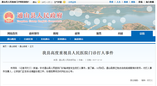針對(duì)通山縣人民醫(yī)院門診輸液室發(fā)生的打人事件,據(jù)了解,12月9日,通山縣委已免去徐良路城管局長職務(wù)。對(duì)打人事件當(dāng)事人,公安部門正在依法調(diào)查處理之中,處理結(jié)果將及時(shí)向社會(huì)公布。