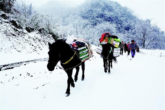 湖北日?qǐng)?bào)訊 因大雪封山,1月28日,崇陽(yáng)縣銅鐘鄉(xiāng)大嶺村一組15戶20余村民,多是70歲左右的老人,被困海拔近千米的深山內(nèi),生活物資告急。該鄉(xiāng)立即組織馬幫將大米、方便面、油、蠟燭等物資送進(jìn)山。