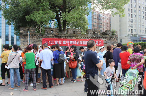 咸寧市婦幼保健院兒科醫(yī)護人員在咸寧市十六潭公園廣場上為孩子們義務(wù)體格檢查