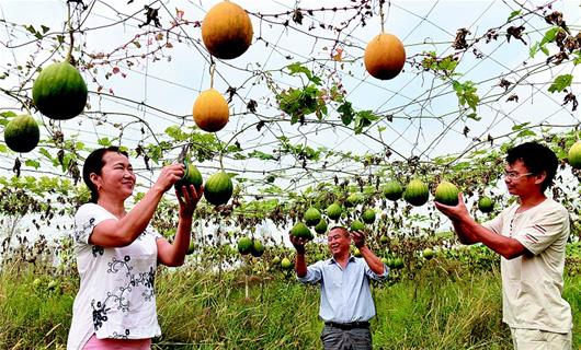 9月16日,在通城縣大坪鄉(xiāng)大坪村,麗明農業(yè)公司員工在中藥材基地采摘瓜蔞。2014年,該村青年徐四明返鄉(xiāng)創(chuàng)業(yè),創(chuàng)辦麗明農業(yè)公司,開發(fā)3000畝荒山播種油茶,并套種瓜蔞、白芨、黨參、玉竹等名貴中草藥。徐四明以“公司+基地+貧困戶”模式,吸收45戶貧困戶務工,戶均年收入3萬元,同時示范帶動周邊5個村百余農戶種中藥材增收。