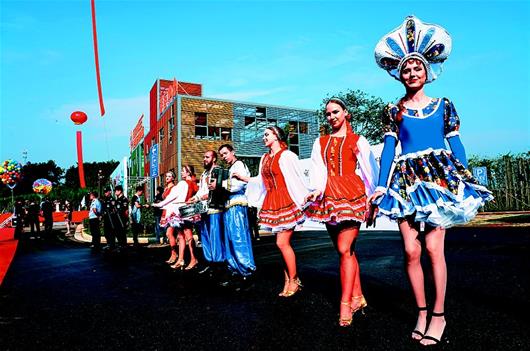 當日,經(jīng)過一年多時間建設的“萬畝茶園·俄羅斯方塊小鎮(zhèn)”揭開面紗。茶園入口,彩球飛揚、人流如織,俄羅斯少女翩翩起舞。走入茶園,齊腰的茶樹漫山遍野、油綠發(fā)亮,異域風情的商業(yè)街、喀秋莎會客廳、四季茶溪花海令人眼前一亮。萬畝茶園原是羊樓洞茶場砂子嶺分場所在地,連片的茶園超過萬畝,主要用于制作青磚茶,是赤壁聞名的旅游地標之一。重新規(guī)劃建設的萬畝茶園,預計總投資5.4億元,擺脫原有單一茶業(yè)種植,瞄準建設全球首家茶文化俄羅斯風情主題公園。
