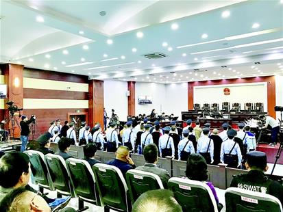 前日上午,庭審開始,23名涉黑團(tuán)伙成員集體站在被告席上,出于部分被告身體不適,審判長(zhǎng)讓被告人坐下聽庭。