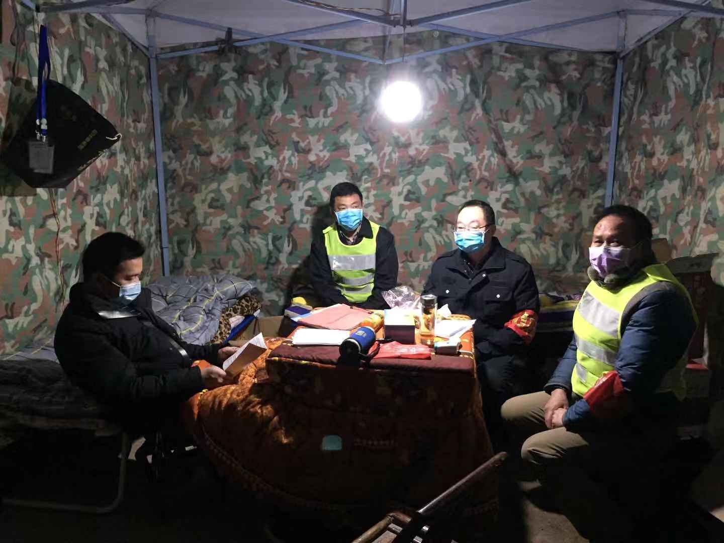 義源村的另一處臨時關卡點,16名黨員干部憑著幾把凳子,幾床被褥堅守陣 地,從1月25日開始, 24小時輪班執(zhí)勤,對外來人員車輛進行勸返消毒,嚴防死守, 為全村疫情防控工作構筑了一道牢固的安全網、防護欄。