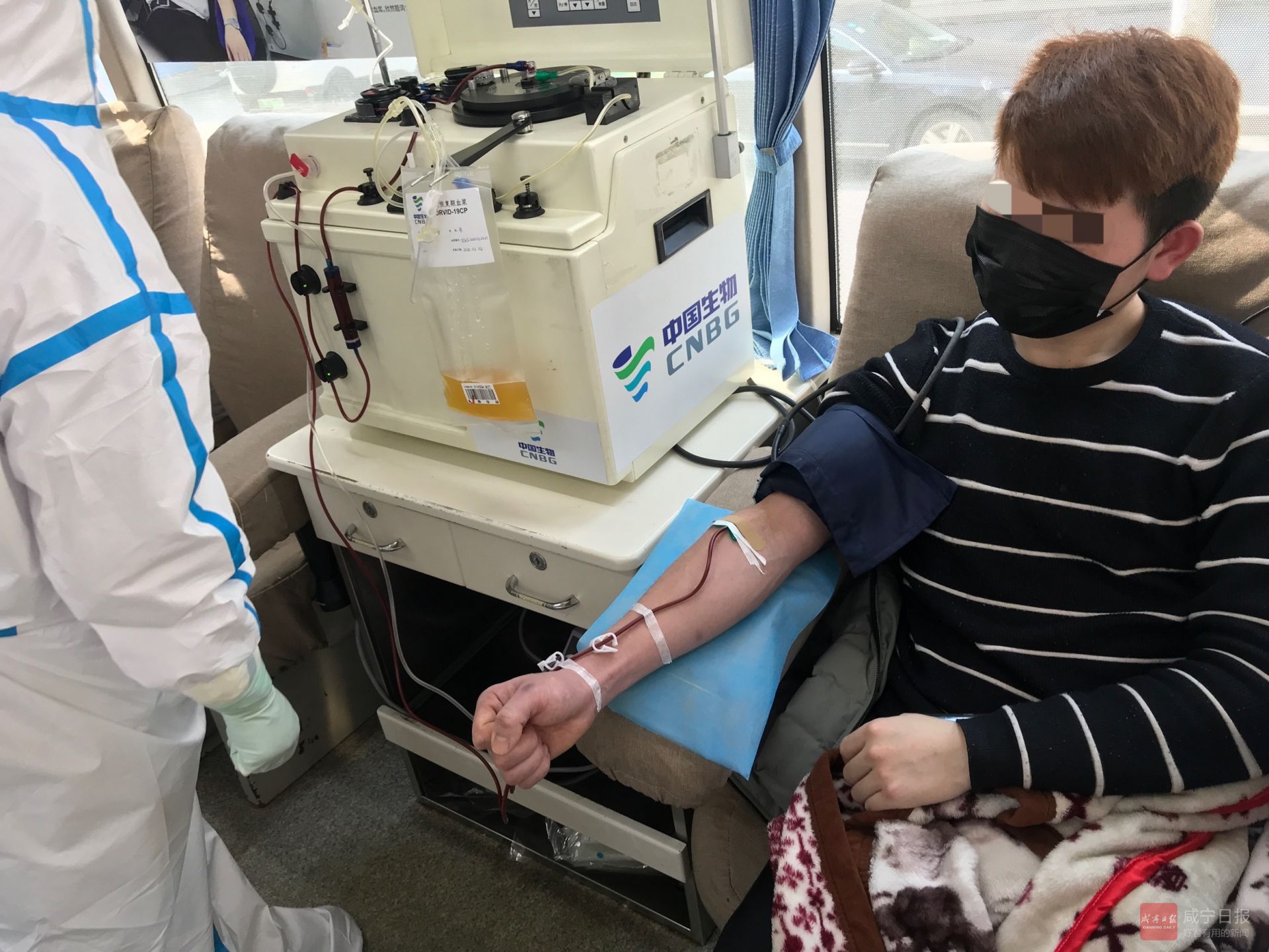 當(dāng)天,治愈患者程某在經(jīng)過(guò)CT、核酸檢測(cè)、體檢征詢等一系列操作后,在咸寧市中心血站流動(dòng)采血車(chē)上接受了血漿采集,共400毫升。