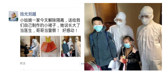 隔離解除,依依惜別,萌娃兄妹把精心制作的手工,送給日夜相伴的“拾光劉越”等醫(yī)護(hù)人員?!伴L大也要當(dāng)醫(yī)生、當(dāng)警察。”稚氣的話語,讓“拾光”感動。