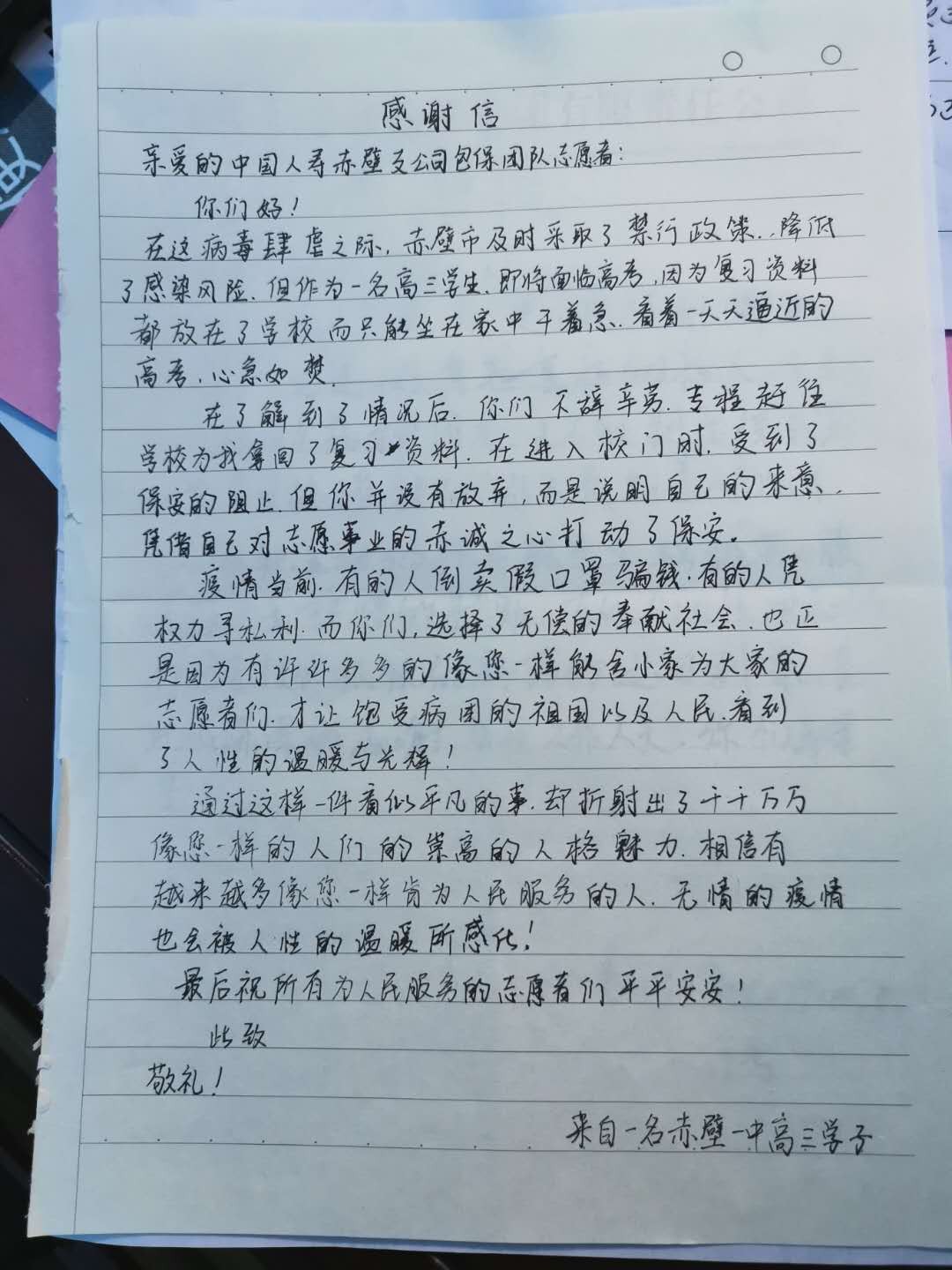 “作為一名即將面臨高考的高三學(xué)生,因?yàn)閺?fù)習(xí)資料都放在了學(xué)校而只能坐在家中干著急。看著一天天逼近的高考,心急如焚!謝謝你們不辭辛勞,專程趕往學(xué)校為我拿回了復(fù)習(xí)資料……”這是一名高三學(xué)生寫給小區(qū)包保單位中國人壽赤壁支公司的一封感謝信。這樣的感謝信該公司還收到很多,有感謝聯(lián)系車輛為患者買藥的,有感謝為他們購買奶粉等生活物資的……