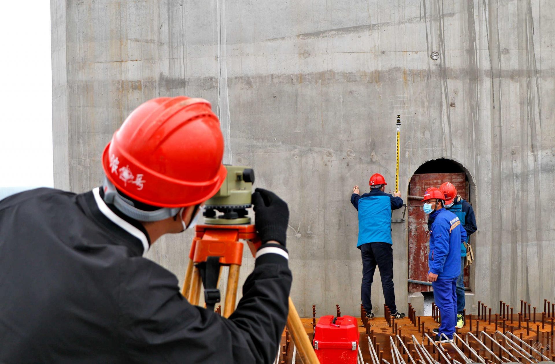 4月21日,赤壁長(zhǎng)江公路大橋項(xiàng)目建設(shè)現(xiàn)場(chǎng),技術(shù)人員為確保鋼梁準(zhǔn)確吊裝,正在進(jìn)行定位測(cè)量。