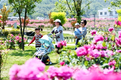 4月27日,游客在通城縣麥?zhǔn)墟?zhèn)冷段村月季莊園賞花。