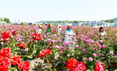通城縣麥?zhǔn)墟?zhèn)冷段村引進(jìn)資金,在200余畝荒地上種植月季花。20多個(gè)品種的月季正值盛花期,每天吸引眾多游客游玩賞花,當(dāng)?shù)匕才?0多位農(nóng)民配套服務(wù),在家門(mén)口增收。