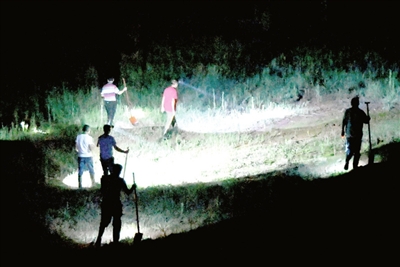 22:43分。在長江赤壁干堤11號哨所責(zé)任堤段,七束燈光在護堤林中閃耀。