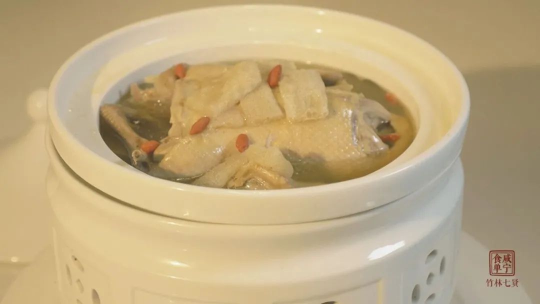 本菜中竹蓀為山珍,鴨為老鴨,高湯炮制,適合老人養(yǎng)生滋補(bǔ)。以山濤歸隱奉老的故事得菜名。