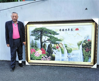 據(jù)金開珠介紹,這幅《幸福萬年長》十字繡長達(dá)3米,高達(dá)2米,由老伴王晚珍手工繡制而成。本有一位老板想以15萬元的價(jià)格收購,但因?yàn)樽约汉屠习榈纳眢w原因,十字繡花了三年多時(shí)間才繡好,老板等不了那么久另尋他人購買了,所以十字繡至今還沒有賣出去。