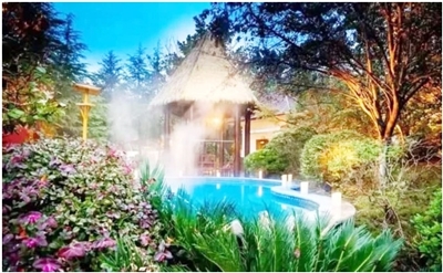 碧桂園的泉眼從上至下流,40多種湯池依據(jù)地勢高低而建。有一處名為“桂花湯”的泡池,泡池內(nèi)不僅添加了桂花的香料和養(yǎng)顏保膚的秘方,池子底部還散出金黃色的光束,隨起伏的水波搖晃,深得考察團(tuán)女性的喜愛。