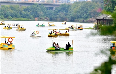 圖③:十六潭公園,游客泛舟湖上,享受美景。
