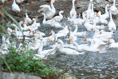 鵝苗在這里生活得確實(shí)挺好:樹林里“閑庭信步”,山泉水里沐浴嬉戲,每天都有鮮美的蟲草吃,夫妻倆每天還會(huì)給它們喂兩次玉米?;蚬攘?,所以,不到4個(gè)月,它們就長到了十多斤。