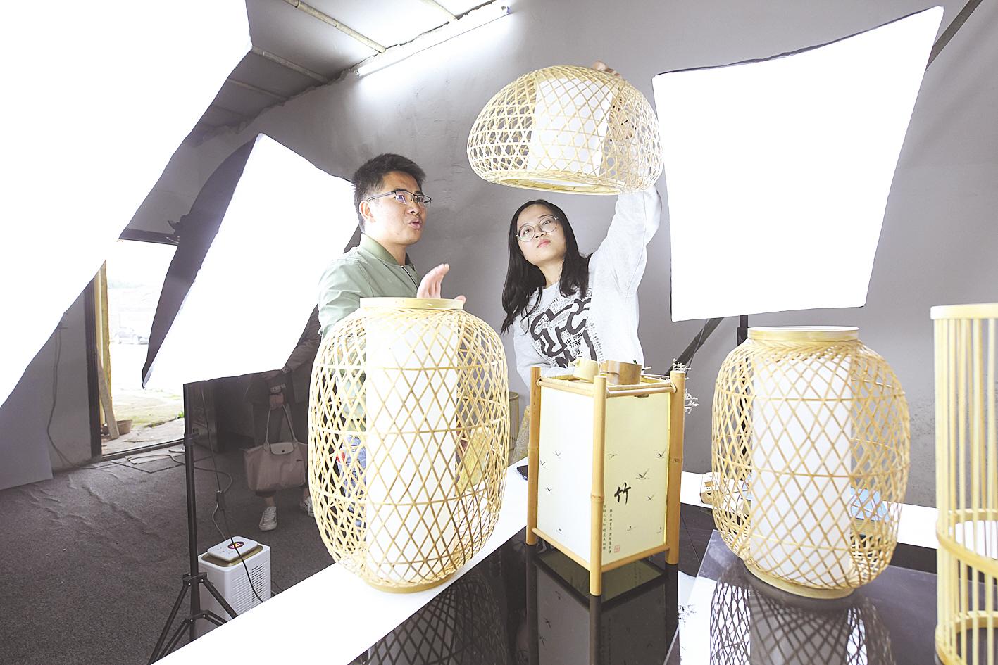10月14日,咸寧市咸安區(qū)大幕鄉(xiāng)雙垅村竹雕藝人在攝影棚向客人介紹竹制家居用品和工藝品。去年5月,當(dāng)?shù)卮髮W(xué)畢業(yè)生賀慈回鄉(xiāng)創(chuàng)業(yè),成立藝竹情工藝品公司,聘請民間藝人手工制作工藝品,通過電商銷售,今年前三季度銷售額500多萬元。