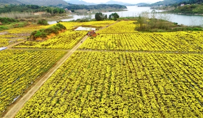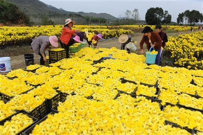 11月4日,通山縣燕廈鄉(xiāng)湖畔村皇菊種植基地,金絲皇菊怒放,猶如一張金色地毯舒展在田野上,村民穿梭在花叢中采收菊花。燕廈鄉(xiāng)湖畔村是典型的庫(kù)區(qū)貧困村,近年來(lái),市公共檢驗(yàn)檢測(cè)中心駐村工作隊(duì)和燕廈鄉(xiāng)黨委政府結(jié)合湖畔村地理環(huán)境,成立村集體合作社,打造60畝金絲皇菊種植基地,延伸菊花深加工產(chǎn)業(yè)鏈,通過(guò)與貧困戶(hù)采取“勞務(wù)聯(lián)結(jié)機(jī)制”簽署合同協(xié)議,讓村民實(shí)現(xiàn)家門(mén)口就業(yè)。