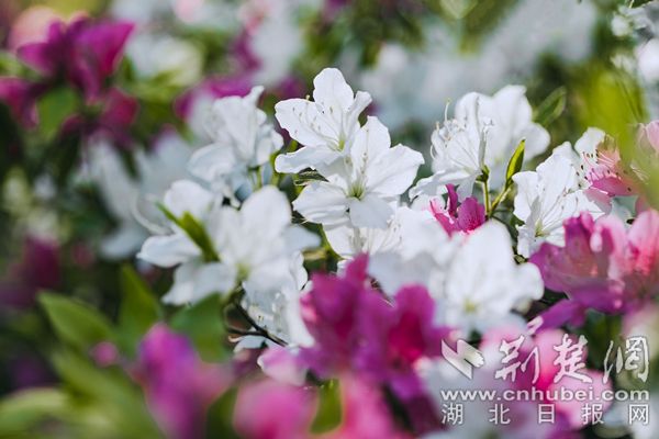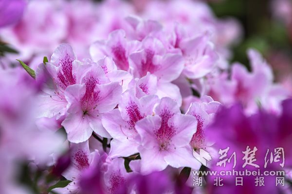 杜鵑花色艷麗,武漢植物園的杜鵑除紅色、紫色、粉色、白色等單色外,還有綠色杜鵑和復(fù)色杜鵑花。從國(guó)外引進(jìn)的綠色杜鵑品種“綠色光輝”,花朵小巧玲瓏,色如碧玉,十分罕見(jiàn)。復(fù)色杜鵑“皇冠”花朵白粉相間,粉紅色鑲邊,素雅又不失顏色,一掃杜鵑的艷麗姿態(tài),既清新又迷人。