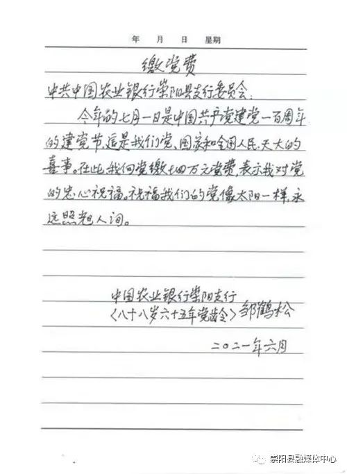 廖海峰告訴記者,來之前,鄒鶴松老人特意向中國農業(yè)銀行崇陽支行黨委寫了一封信,信里這樣寫著:“今年是中國共產黨建黨100周年,這是我們黨、國家和全國人民天大的喜事。在此,我向黨繳納4萬元黨費,表示我對黨的衷心祝福。祝福我們的黨像太陽一樣,永遠照耀人間?!币痪渚浜唵螛銓嵉恼Z言,彰顯著一名老黨員赤心向黨、一心為黨樸實而偉大的情懷。
