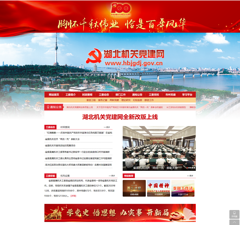 荊楚網(wǎng)(湖北日報網(wǎng))訊(記者謝頤 通訊員鄭羽嬋)在中國共產(chǎn)黨成立100周年之際,湖北機關(guān)黨建門戶網(wǎng)站湖北機關(guān)黨建網(wǎng)(http://www.hbjgdj.gov.cn/)電腦端、移動端全新改版上線。這是省委直屬機關(guān)工委積極探索智慧黨建的有效途徑,是加強省直機關(guān)黨建宣傳工作的重要舉措,是為黨慶生、為黨祝福獻上的特殊禮物。