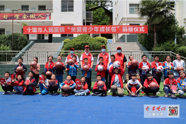 簡單用過午餐,鐘森顧不得午休,又帶領(lǐng)駐村工作隊(duì)同志,到槐樹林特場小學(xué),為孩子們送去特別的“六一禮物”——十堰人醫(yī)干部工捐贈(zèng)的價(jià)值1.2萬元的15份“關(guān)愛青少年成長包”,每個(gè)“成長包”內(nèi)有一個(gè)籃球、一個(gè)排球、一個(gè)足球、一副羽毛球拍和兩筒羽毛球、一副乒乓球拍和一袋乒乓球,這些包含人醫(yī)情的“成長包”,將分配到全校六個(gè)年級,由班級管理、全體學(xué)生共享。孩子們抱著嶄新的節(jié)日禮物,開心得合不攏嘴,紛紛感謝十堰人醫(yī)叔叔阿姨們的愛心善舉。