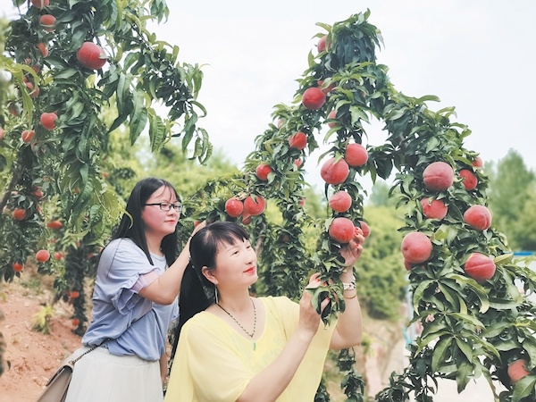 6月8日,游客在丹江口市均縣鎮(zhèn)均州蜜桃采摘園采摘蜜桃。眼下,正值蜜桃成熟期,該園吸引了不少游客前來(lái)采摘。據(jù)了解,2019年4月,原鄉(xiāng)人張慶華投資400多萬(wàn)元成立丹江口市億園果樹(shù)種植專業(yè)合作社,在當(dāng)?shù)亓鬓D(zhuǎn)200余畝荒地種植蜜桃,今年可采摘蜜桃25萬(wàn)公斤,收入200余萬(wàn)元,帶動(dòng)70余名農(nóng)戶平均增收6000元。記者李平攝