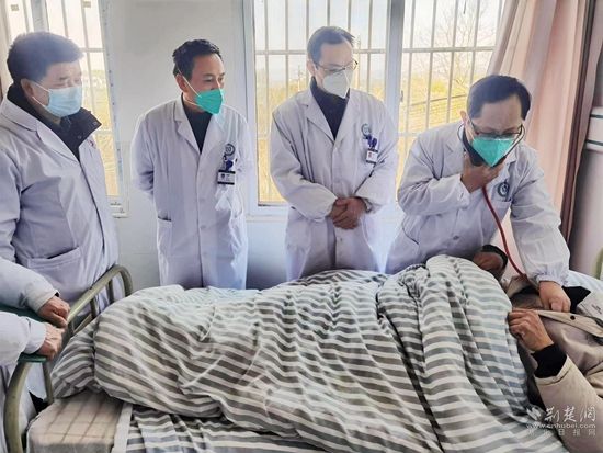 荊楚網(wǎng)(湖北日報(bào)網(wǎng))訊(通訊員程曉林 李 勇 饒國?。?/strong>1月6日下午4時(shí)10分,在浠水縣綠楊鄉(xiāng)衛(wèi)生院三樓住院部病房里,浠水縣人民醫(yī)院副院長、主任醫(yī)師黃大雄帶領(lǐng)該院第5醫(yī)療救治專家組主任醫(yī)師付鴻鷹、副主任醫(yī)師柴小利同綠楊衛(wèi)生院醫(yī)務(wù)人員一起,給82歲的新冠感染患者張鳳銀婆婆進(jìn)行會診。