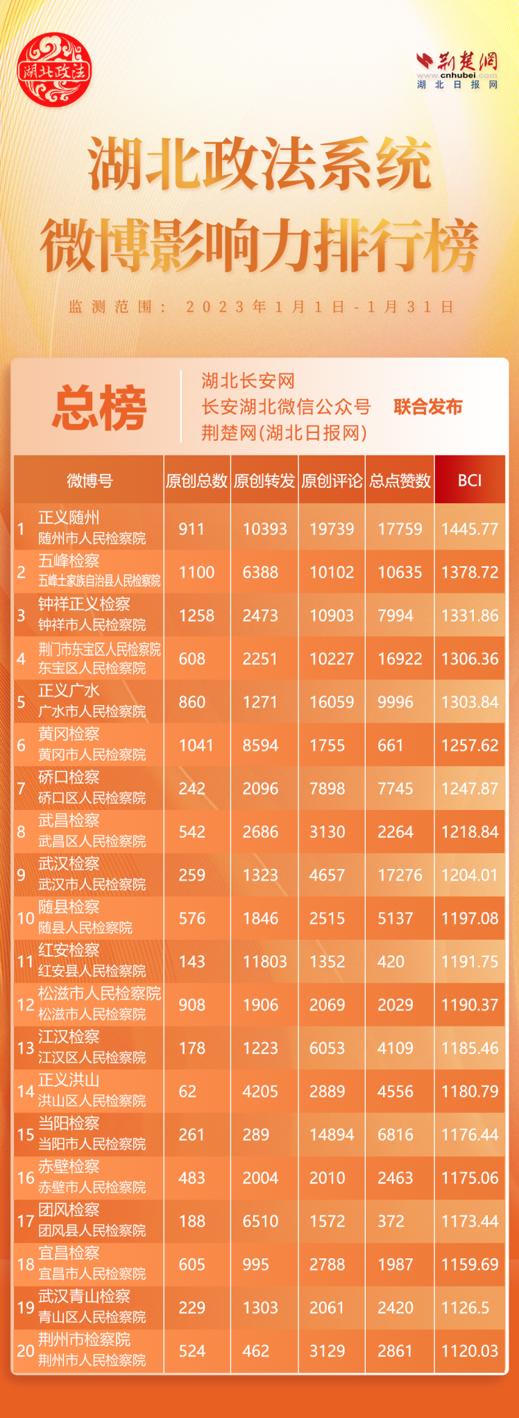 湖北政法系統(tǒng)495個官方微博賬號參加評選,政法委系統(tǒng)10個、法院系統(tǒng)98個、檢察系統(tǒng)130個、公安系統(tǒng)244個、司法系統(tǒng)13個。 “黃岡檢察”、“紅安檢察”、“團(tuán)風(fēng)檢察”3家單位上榜,分別排名第6位、第11位、第17位。