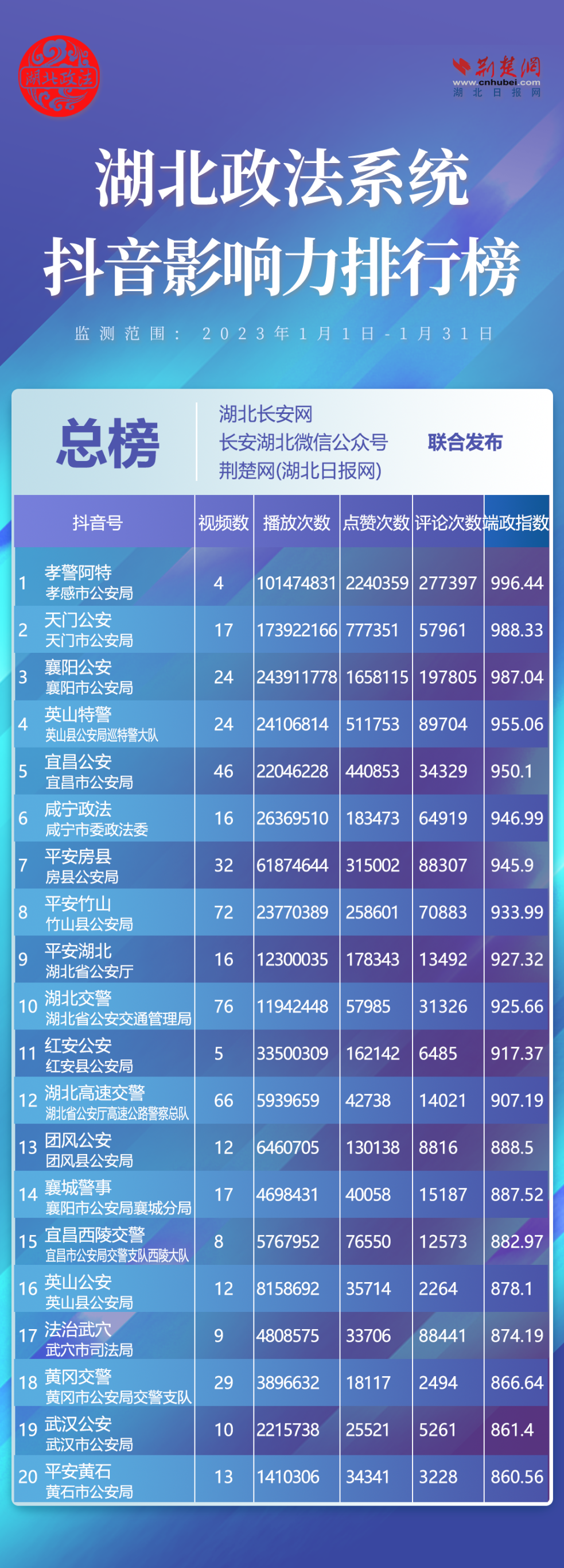 湖北政法系統(tǒng)370個抖音帳號參加評選,其中政法委系統(tǒng)82個、法院系統(tǒng)52個、檢察系統(tǒng)8個、公安系統(tǒng)195個、司法系統(tǒng)33個?!坝⑸教鼐薄ⅰ凹t安公安”、“團(tuán)風(fēng)公安”、“英山公安”、“法治武穴”、“黃岡交警”6家單位強(qiáng)勢上榜,分別排名第4位、11位、13位、16位、17位、18位。