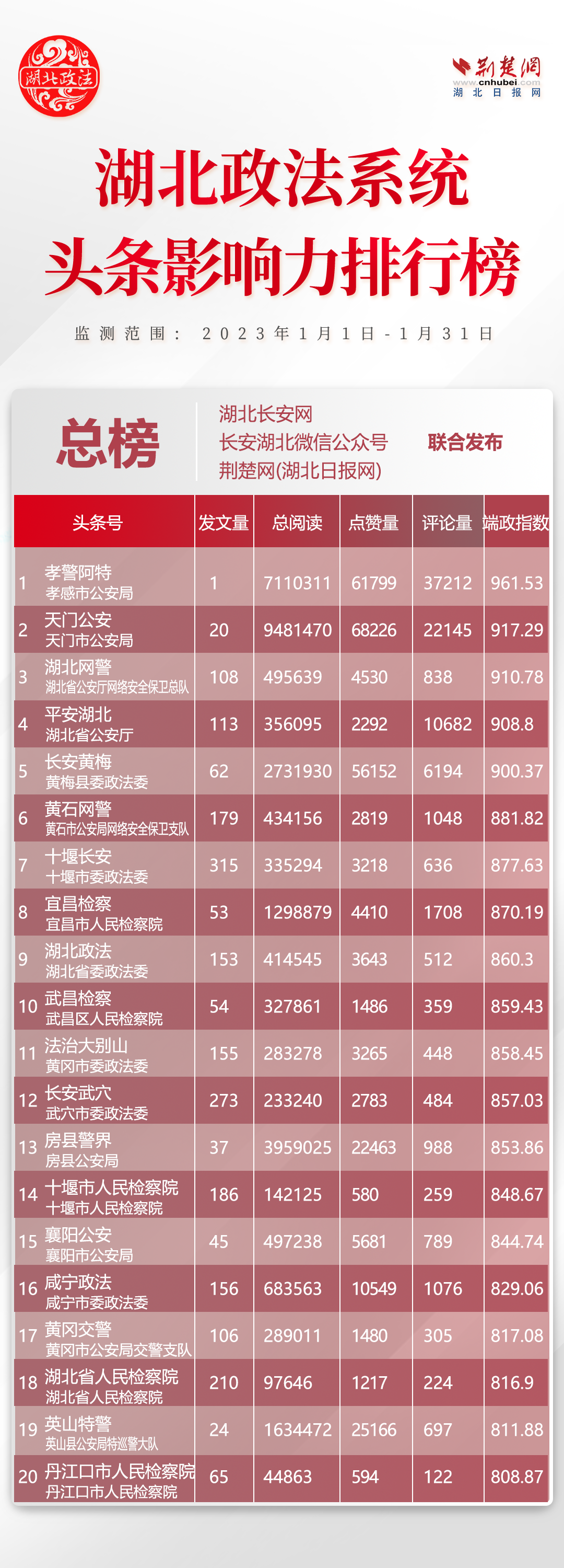 荊楚網(wǎng)(湖北日報網(wǎng))訊(記者胡小軍)2月13日,湖北省委政法委官網(wǎng)湖北長安網(wǎng)、官微長安湖北聯(lián)合荊楚網(wǎng)(湖北日報網(wǎng))、楚天輿情數(shù)據(jù)研究院發(fā)布湖北政法系統(tǒng)新媒體影響力排行1月榜單,黃岡政法系統(tǒng)多家單位入圍。