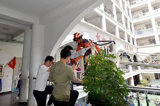 “火災”發(fā)生后,學校立即啟動應急疏散預案:由老師組織學生有序疏散、安保人員進行初期火災撲救,同時撥打119電話報警。消防人員到場后迅速開展滅火救援,并利用云梯消防車成功解救兩名行動不便的被困高樓層的學生。