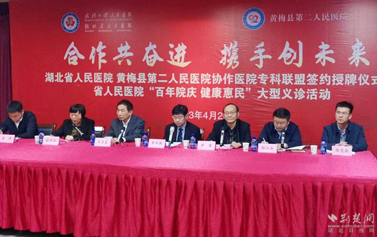 荊楚網(wǎng)(湖北日報網(wǎng))訊(通訊員劉學(xué)平)4月23日,湖北省人民醫(yī)院和黃梅縣第二人民醫(yī)院(孔壟鎮(zhèn)衛(wèi)生院)協(xié)作醫(yī)院??坡?lián)盟簽約授牌暨省人民醫(yī)院“百年院慶 健康惠民”大型義診活動在黃梅縣孔壟鎮(zhèn)舉行。