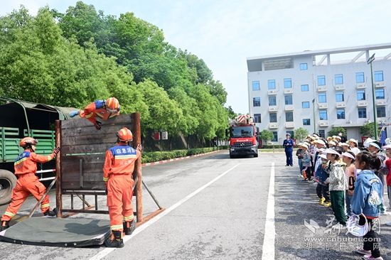 同時(shí),全體師生觀看了攀爬繩索上樓、翻越障礙板、液壓鉗夾乒乓球、無(wú)齒鋸切割鋼絲等項(xiàng)目,感受消防員日常訓(xùn)練、生活。更讓他們激動(dòng)的是,孩子們?cè)谙朗迨宓谋Wo(hù)下乘坐登高平臺(tái)車(chē)體驗(yàn)了呼嘯云端救人的驚險(xiǎn),真是過(guò)足了一把當(dāng)“小小消防員”的癮,火熱的太陽(yáng)也絲毫阻擋不了師生們了解消防、體驗(yàn)消防、點(diǎn)贊消防的熱情。